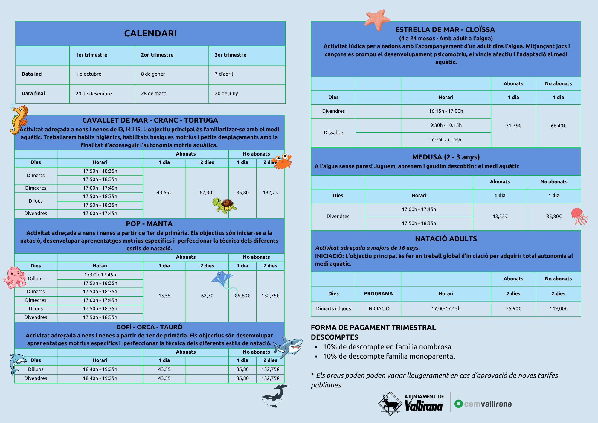 Curs per nens a partir de 3 anys on l’objectiu és aprendre a nedar d’una manera correcte tots els estils de natació. Per assolir aquest objectiu, els cursos estan estructurats per nivells distingits per animals.